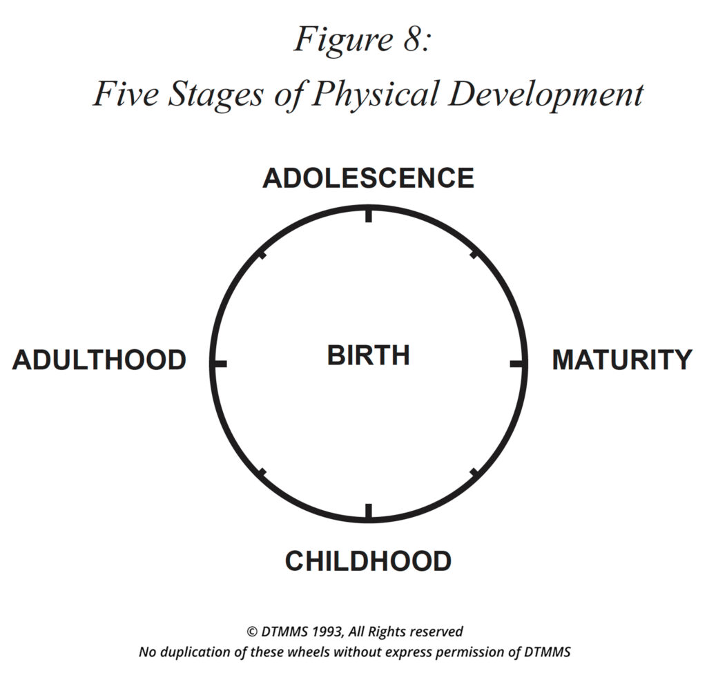 The Five Stages in the South of the Five Evolutionary States Overview Wheel describe the Physical Development (see Figure 8) of all humans. While we are in a physical body, we grow through these stages of physical development in order to achieve elemental balance. This wheel indicates our tonal 3rd dimension evolution and development. Each of the five states are critical learning periods of physical evolution within our own maturational development.