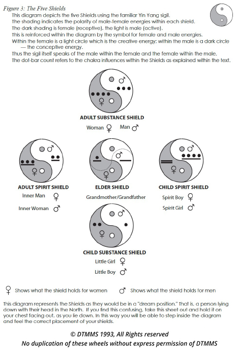 The Shields (see Figure 3) are located in front and behind, to the left and right, and dead center of your body. This figure shows the configuration the Shields would be in a “dream position,” that is, a person lying down with their head in the north. When you are standing up, the Spirit Shields stay in the same position but the Child Substance Shield is in back and the Adult Substance Shield is in front. The Elder Shield stays in the center always. Your Elder Shield encompasses the circumference of your waist.