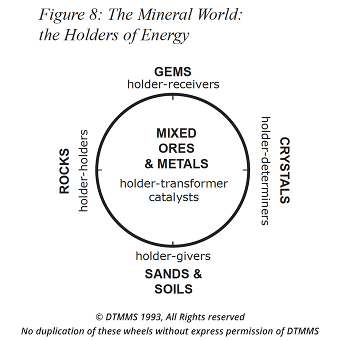 Let us look at the first World: The Minerals are the holders of energy (see Figure 7A). The saying goes, that “within one grain of sand lies the entire Universe.” It is from the Mineral World that plants are born, so we might say that what is “held” is the potential for life. The Mineral World teaches us that substance is primarily a container, a vessel for spirit. The Mineral World is thus like our physical body.