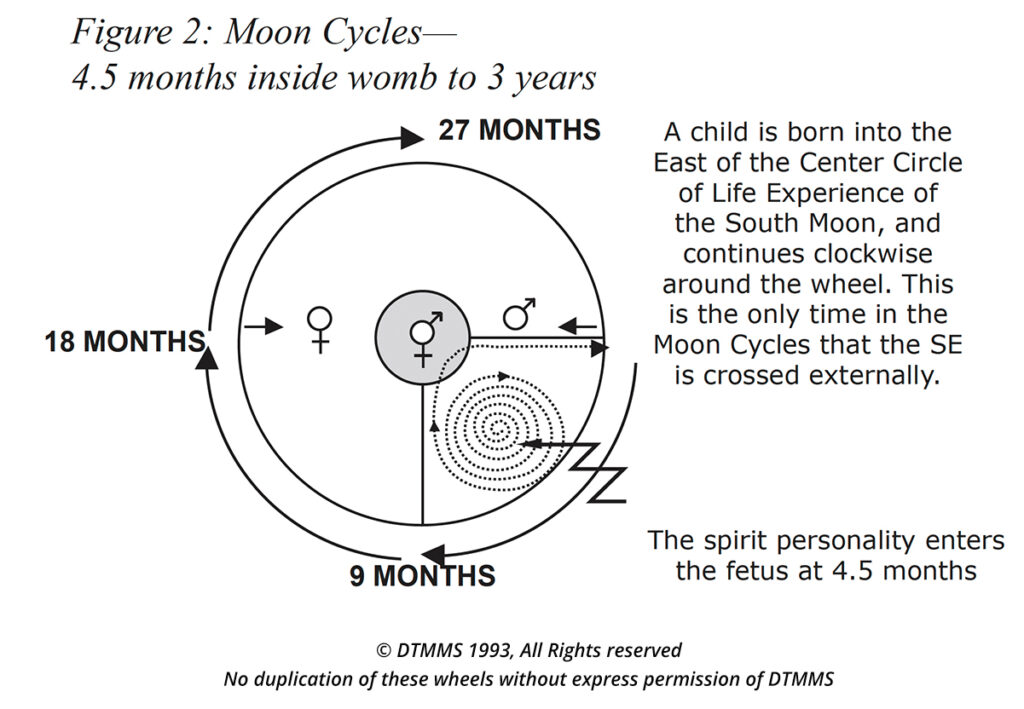 The one exception to this is the very first Circle of Life Experience. At 4.5 months, inside the womb, the spirit personality enters the body of the fetus. (See Figure 2.) At that point, it picks up its true nature spirit and its concepts of self, life, and others, as well as its attitude and approach toward life. It looks directly across the wheel into the Northwest, into its Book of Life and what it has written for this lifetime. Then it is born as a child into the East of the Center Circle of Life Experience of the South Moon and continues clockwise around the wheel. This is the only time in the Moon Cycles that the Southeast is crossed externally. We are born out of the East and travel clockwise around the first Circle of Life Experience.