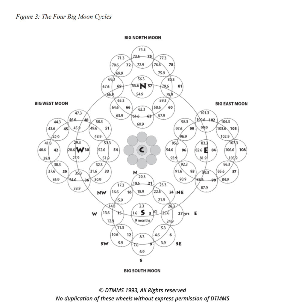 In Figure 3, you will see the Four Big Moons and the nine Circles of Life Experience within each of those Big Moons. The numbers in the cardinal directions indicate your age in years and months. For example, 20.3 is read as 20 years and 3 months. These are ages at which you will leave each direction and move clockwise to the next direction on the wheel.