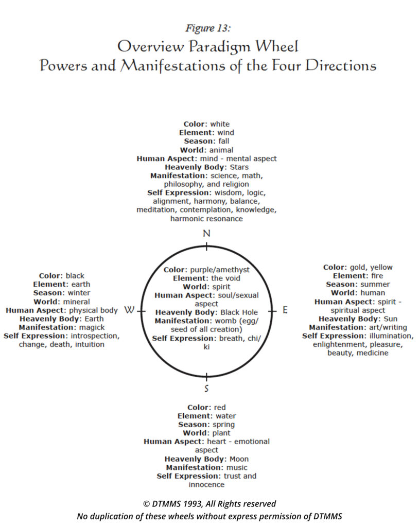 As you look at Figure 13, the Overview Paradigm Wheel, you can quickly see all of the powers of the four directions and their manifestations. Connections can be made very quickly when the wheels are layered as they are here. We encourage you to look for your own connections and insights within this overlay of wheels.