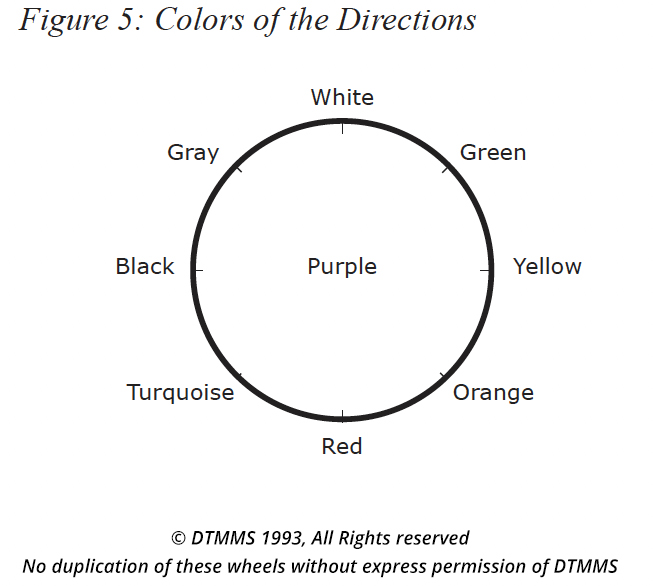 Let us further overlay these wheels and say that the colors (see Figure 5) which vibrate with these directions are as follows: the South is known by the color red, the West by the color black, the North by the color white, the East by the color yellow, and the Center by the color purple.